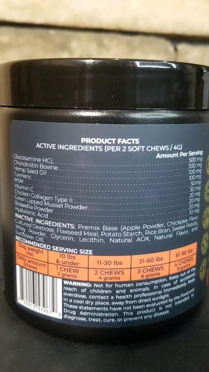 Overall, this is a pretty good supplement for its price point. The dosage instructions only go up to 90lbs and my Rottweiler is 115lbs, so I gave him a bonus chew for being big. I'd like for the supplement to be a bit more potent with certain compounds, but still like all of the ingredients. I think this would be a good starter product for dogs new to glucosamine and chondroitin, but probably is not strong enough for elderly or quite worn down dogs.